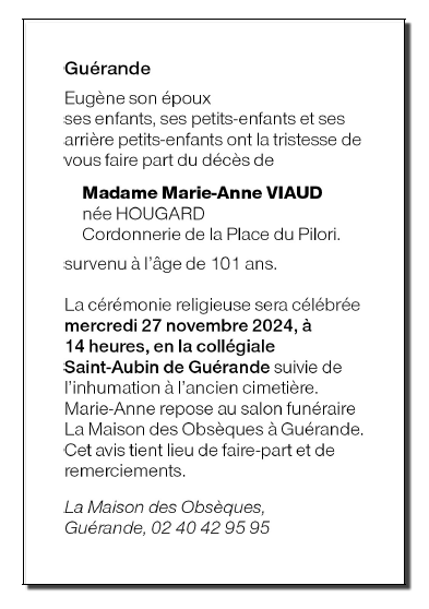 Décédée à Le Croisic (44490, France) le jeudi 21 novembre 2024 à l'âge de 101 ans