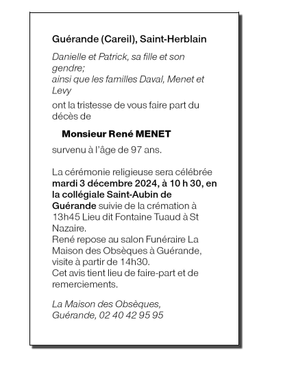 Décédé à Rezé (44400, France) le dimanche 24 novembre 2024 à l'âge de 96 ans