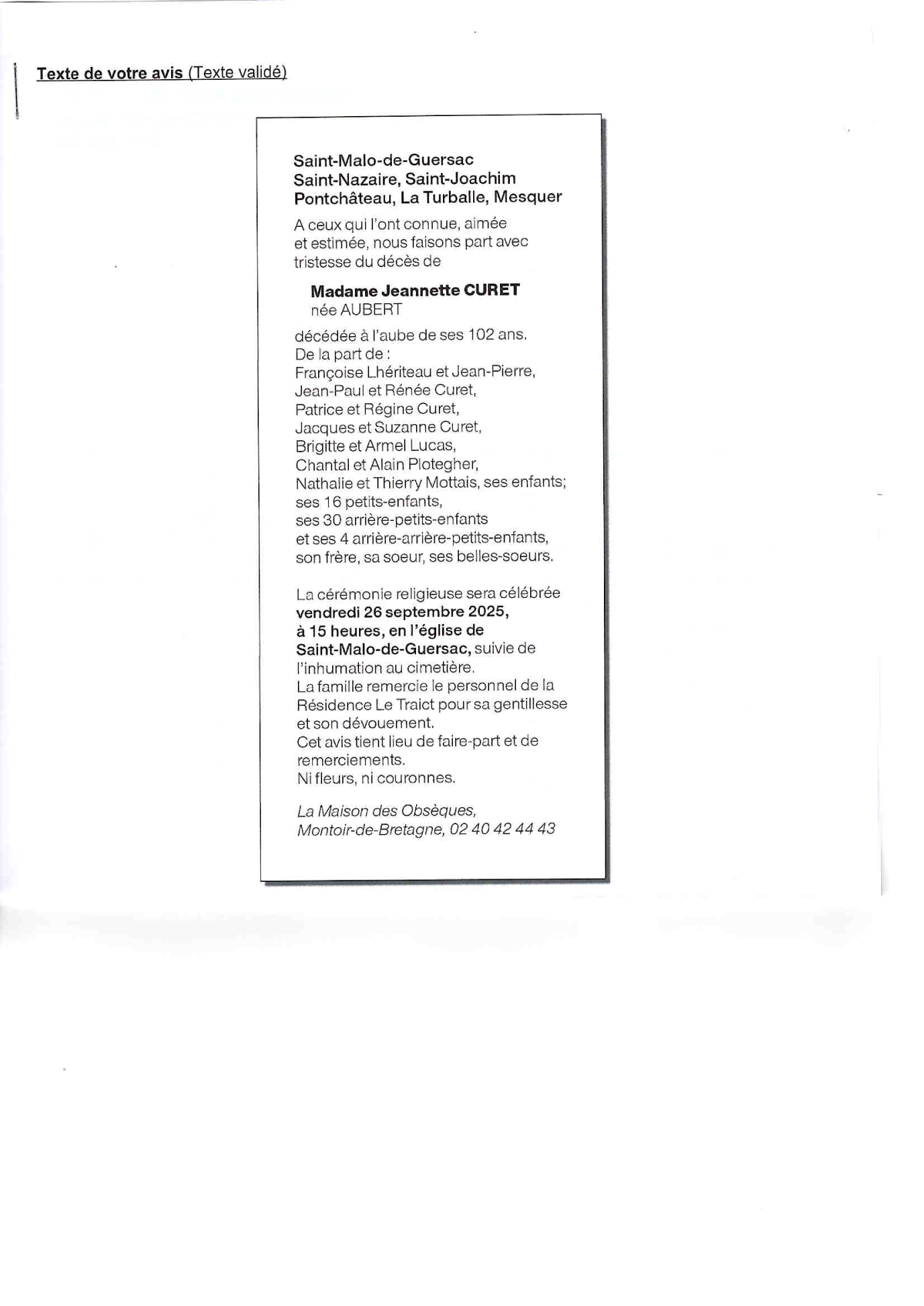 Annonce nécrologique Mme CURET Jeannette