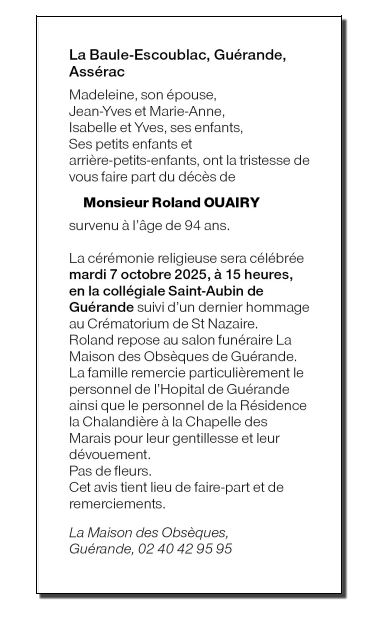 Décédé à Guérande (44350, France) le samedi 27 septembre 2025 à l'âge de 94 ans
