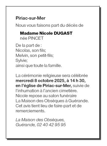 Née à Piriac-sur-Mer (44420, France) le lundi 19 février 1934