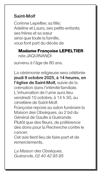 Veuve de Monsieur Daniel LEPELTIER