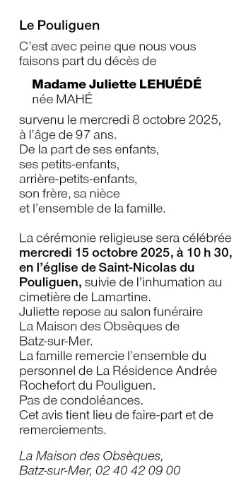 Madame Juliette LEHUÉDÉ née MAHÉ