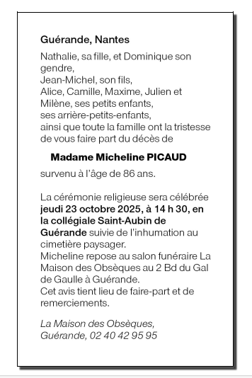 Décédée à Nantes (44000, France) le vendredi 17 octobre 2025 à l'âge de 86 ans