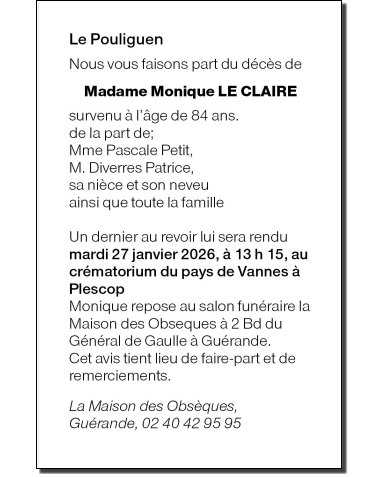 Décédée à Le Croisic (44490, France) le dimanche 18 janvier 2026 à l'âge de 84 ans