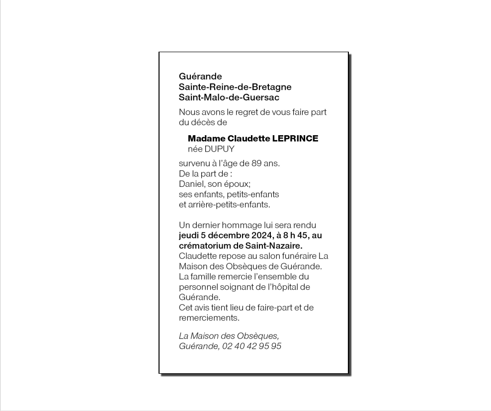Décédée à Guérande (44350, France) le vendredi 29 novembre 2024 à l'âge de 89 ans