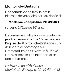 Décédée à Montoir-de-Bretagne (44550, France) le vendredi 14 mars 2025 à l'âge de 97 ans
