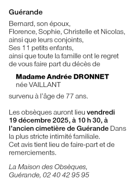 Décédée à Guérande (44350, France) le samedi 13 décembre 2025 à l'âge de 77 ans