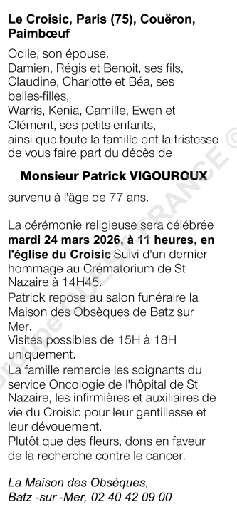 Décédé à Le Croisic (44490, France) le lundi 16 mars 2026 à l'âge de 77 ans