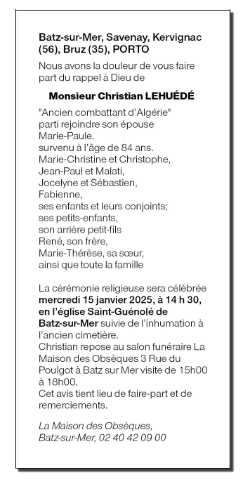 Décédé à Savenay (44260, France) le vendredi 10 janvier 2025 à l'âge de 84 ans