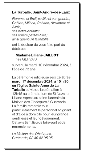 Décédée à La Turballe (44420, France) le mardi 10 décembre 2024 à l'âge de 73 ans