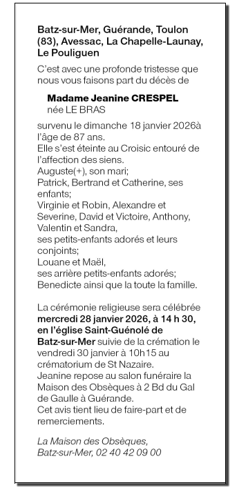 Décédée à Le Croisic (44490, France) le dimanche 18 janvier 2026 à l'âge de 87 ans