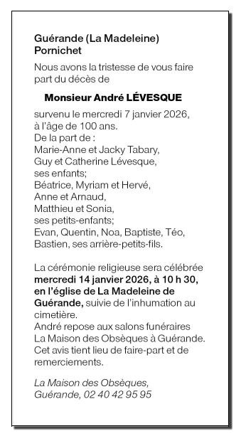 Décédé à Le Croisic (44490, France) le mercredi 7 janvier 2026 à l'âge de 100 ans