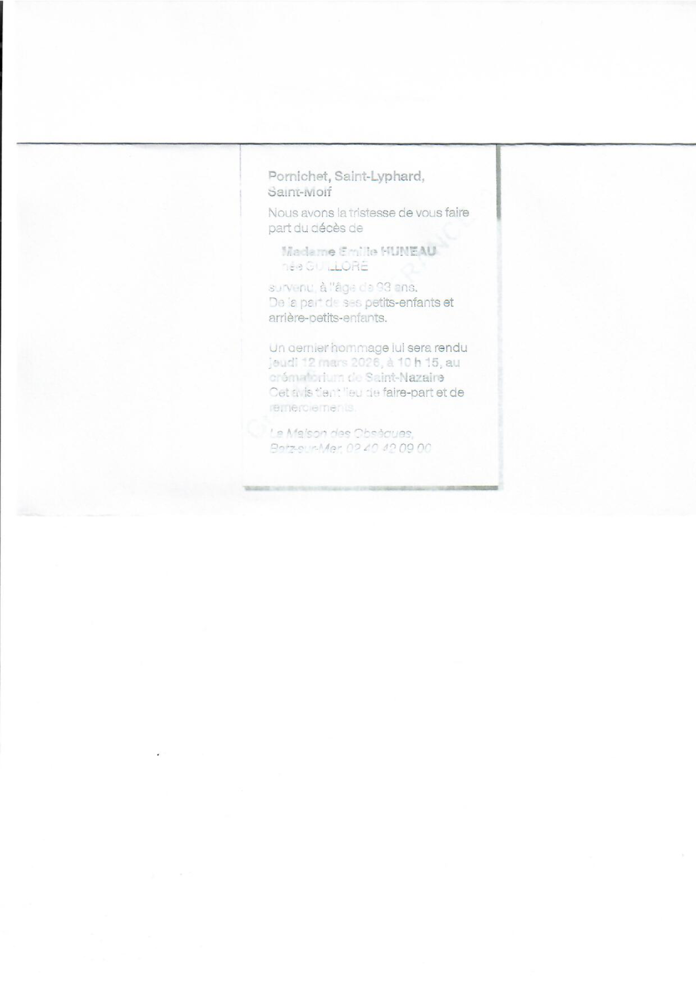 Veuve de Monsieur Emile HUNEAU