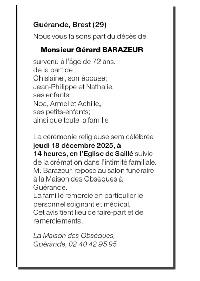 Décédé à Guérande (44350, France) le jeudi 11 décembre 2025 à l'âge de 72 ans