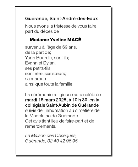 Décédée à Challans (85300, France) le mercredi 12 mars 2025 à l'âge de 69 ans