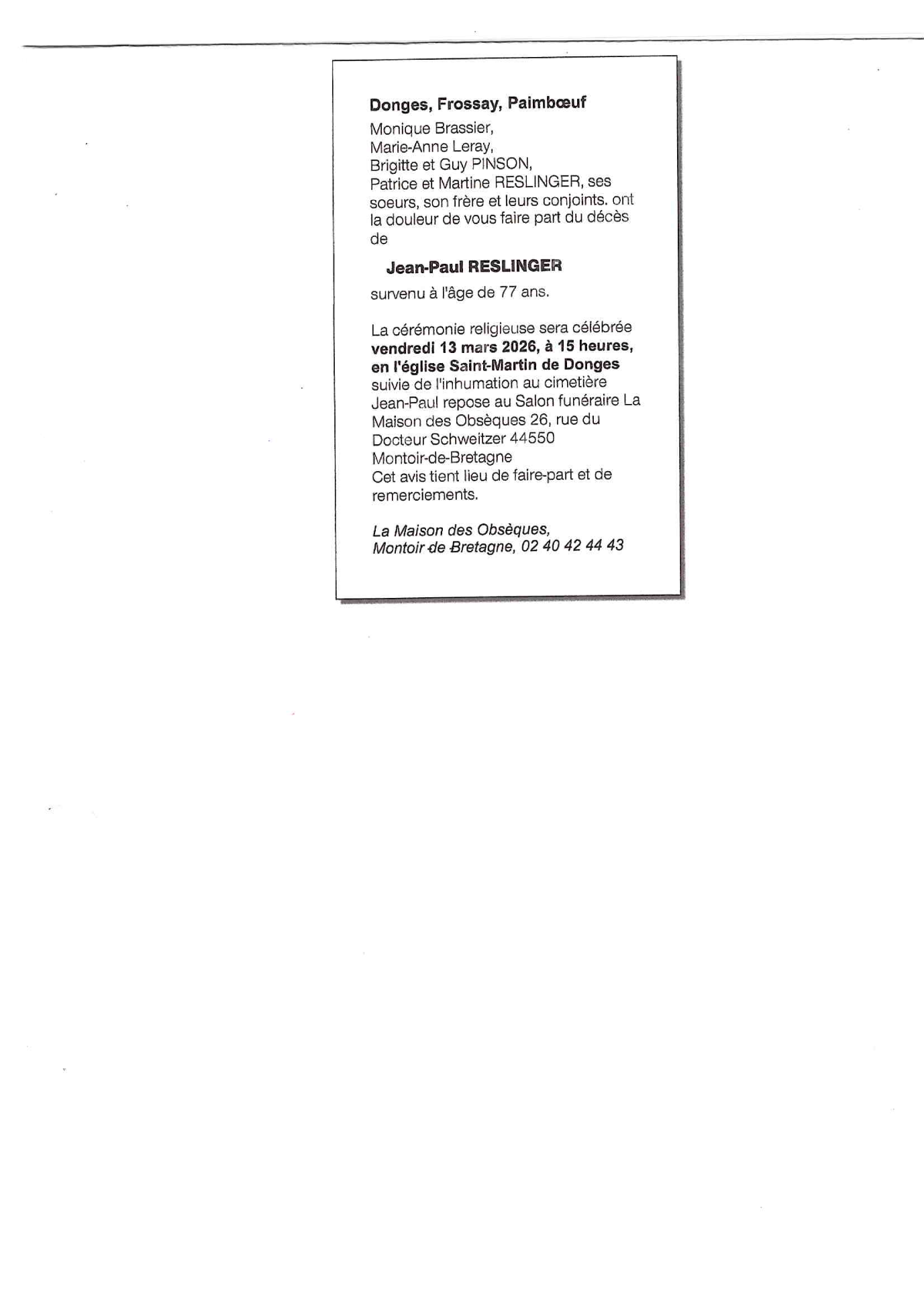 Veuf de Madame JOELLE RESLINGER