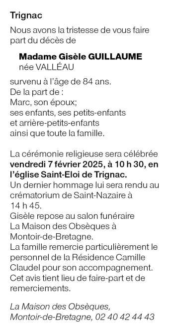 Madame Gisèle GUILLAUME née VALLÉAU