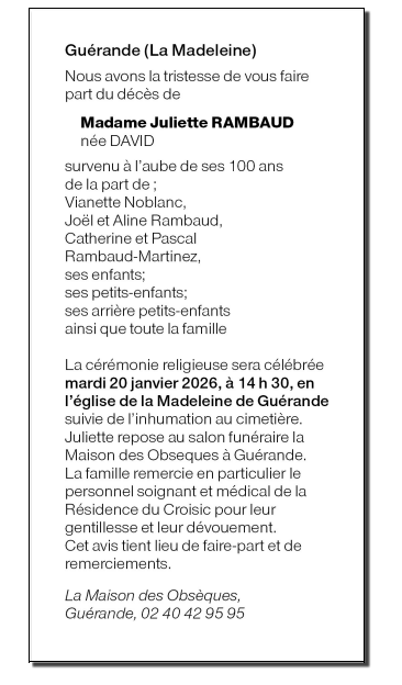 Décédée à Le Croisic (44490, France) le mardi 13 janvier 2026 à l'âge de 99 ans
